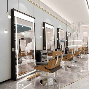 در سالن های زیبایی و آرایشگاه ها نوعی از آینه های چراغ دار اجرا شده که به صورت قدی بوده و معمولا به صورت دو طرفه می باشد بدین شکل نمای زیبایی در فضای داخلی ایجاد خواهد شد ، آینه های آرایشگاه در مجله ی THE BEST DESIGN به عنوان برترین طرح آینه معرفی شده است از همین رو طراحان از ان به کرات استفاده می کنند .